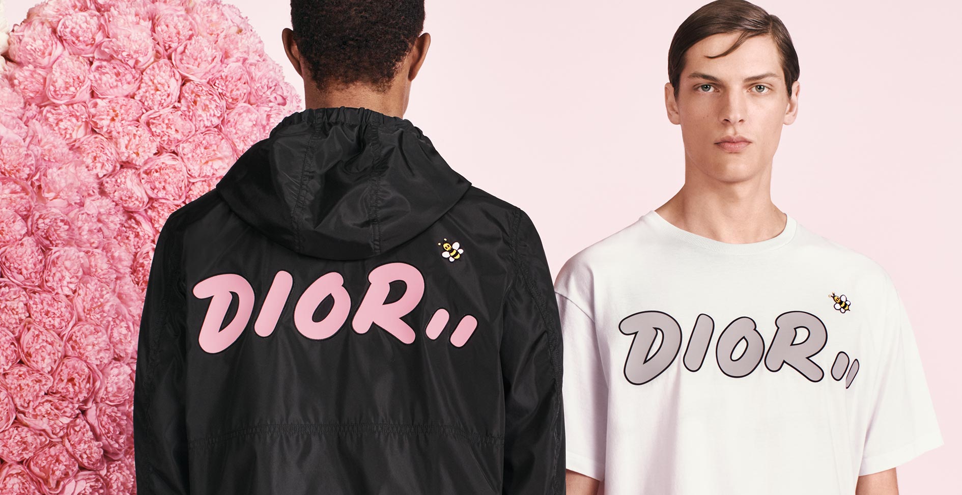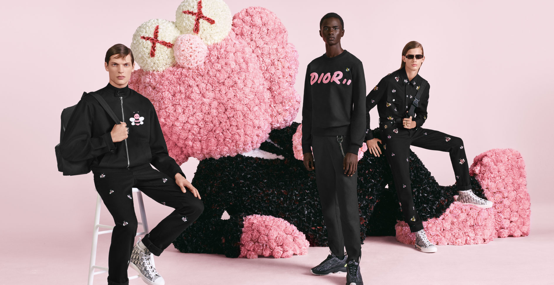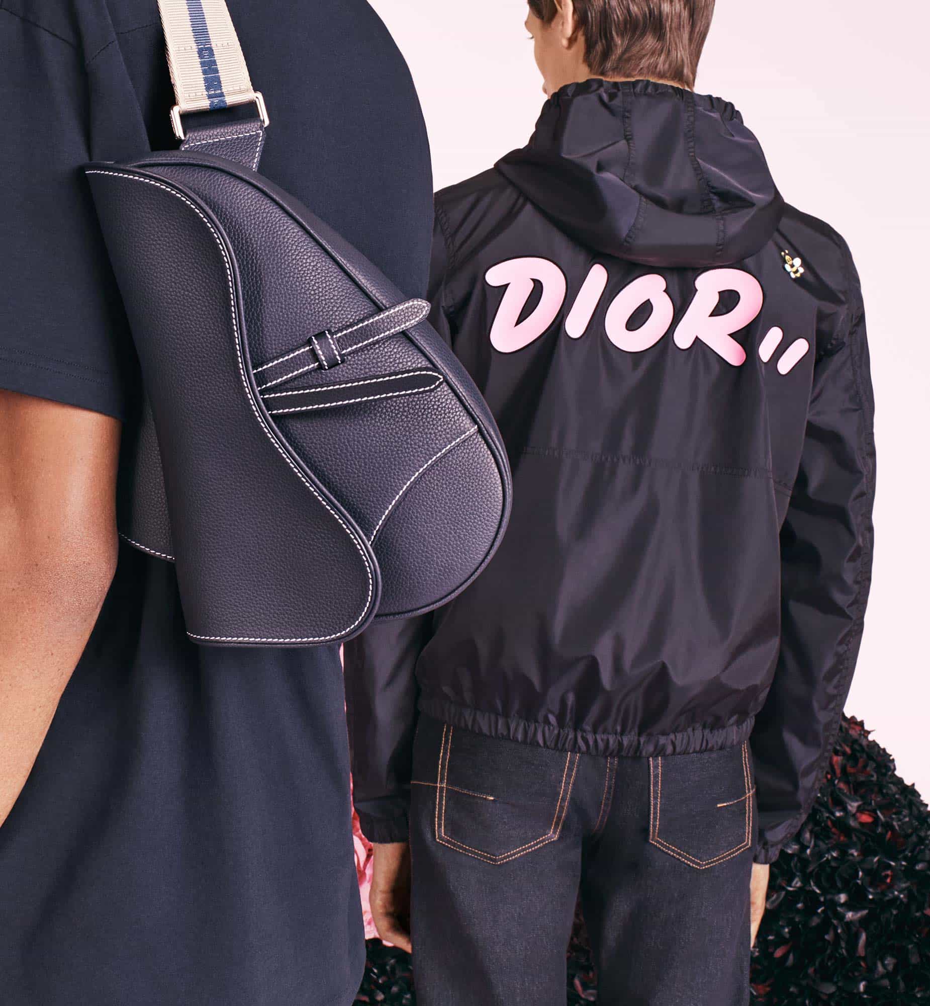 For his first show for Dior, Kim Jones celebrates the heritage of the Maison by combining haute couture, tailoring and sportswear codes. Always tuned into the latest trends, the Artistic Director of men’s collections commissioned the New York artist KAWS to interpret the iconic bee, as well as the Dior logo. These two revisited symbols feature on T-shirts, sweaters and trousers. The bee, toile de Jouy, Dior Oblique canvas, the flowers that were so dear to Christian Dior, the Saddle bag or the laser-cut ‘Cannage’ motif, all these elements express and reinvent themselves freely. – Dior.com