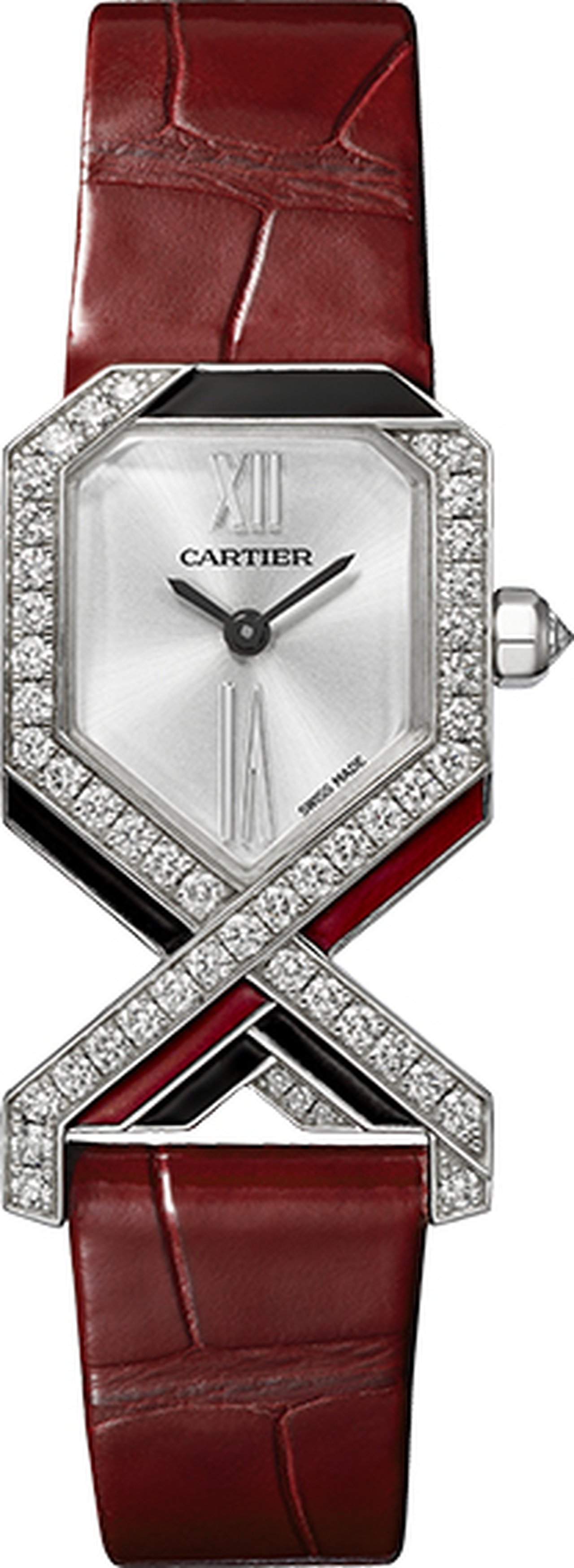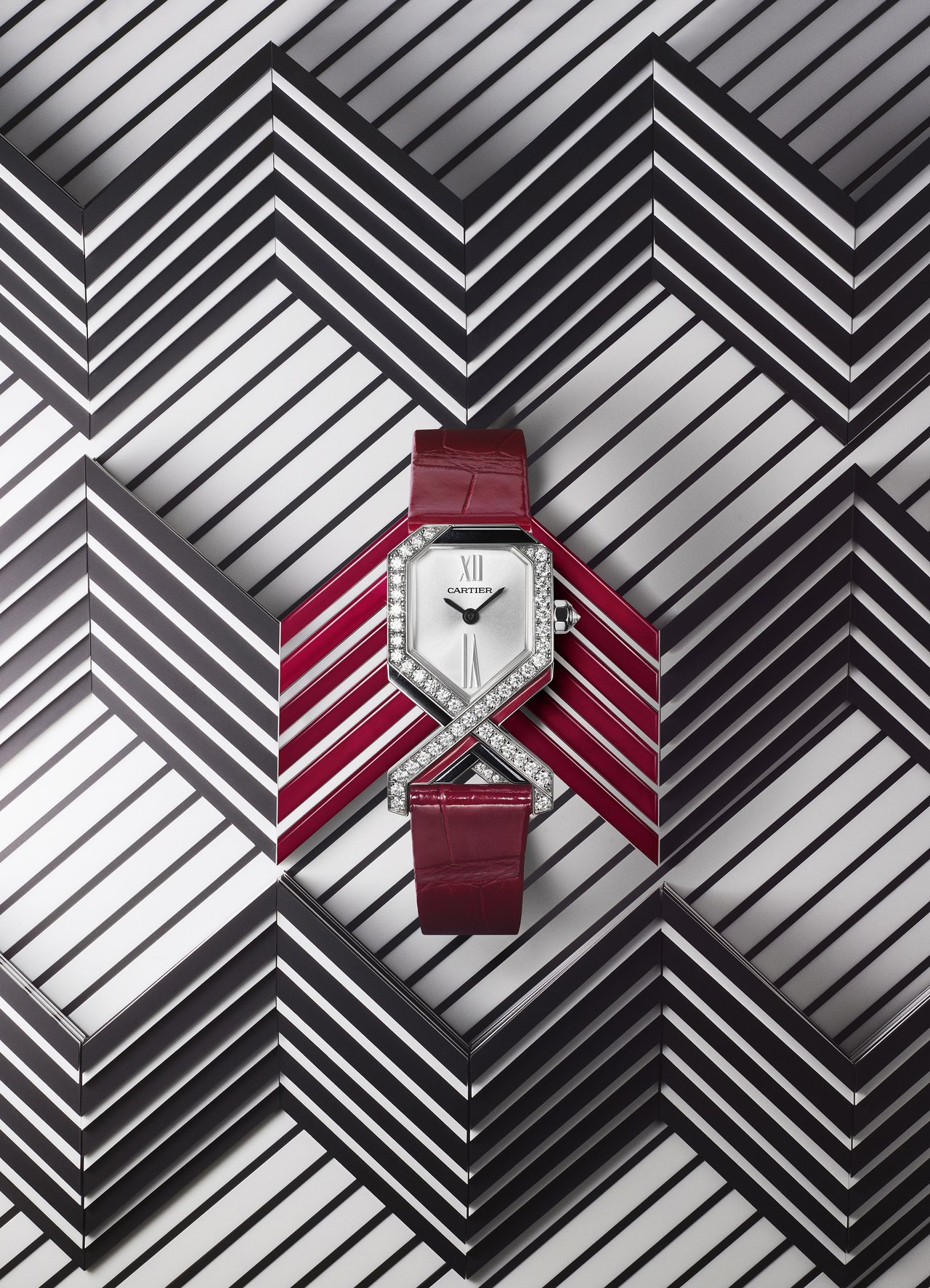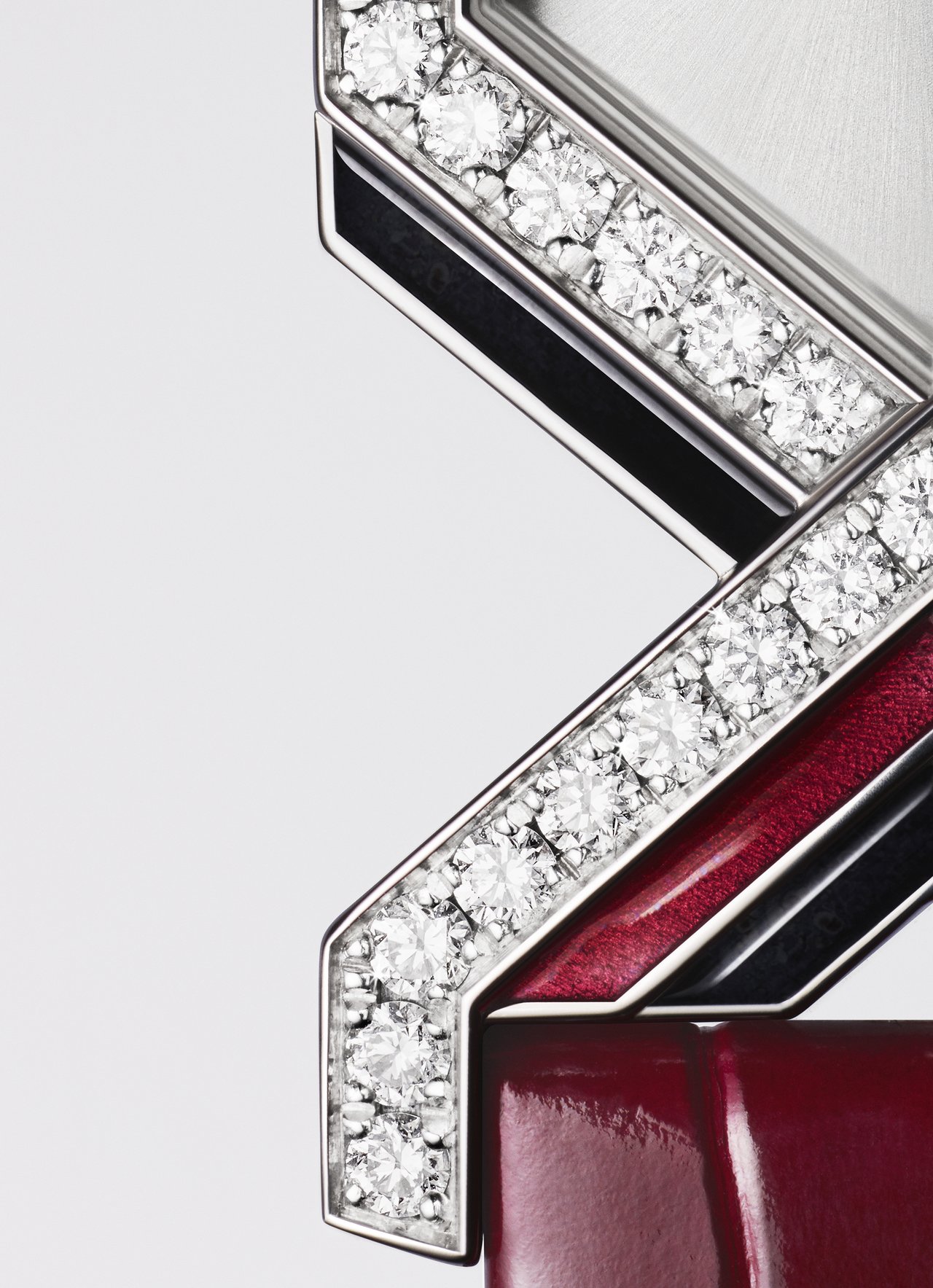 The lines of red or black enamel are accompanied by paved diamonds, leading a new and daring harmony to emerge from the use of colour. With a minuscule dial distinctively stamped with Cartier’s watchmaking codes, the Diagonale watch pays homage to a heritage of disrupting the classics.