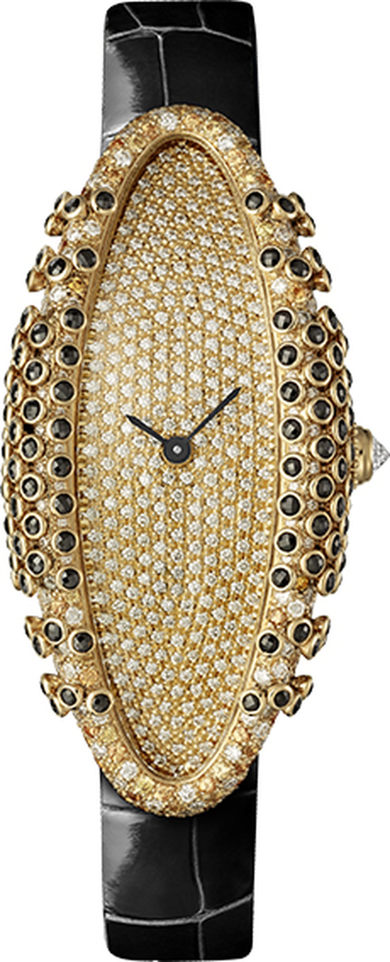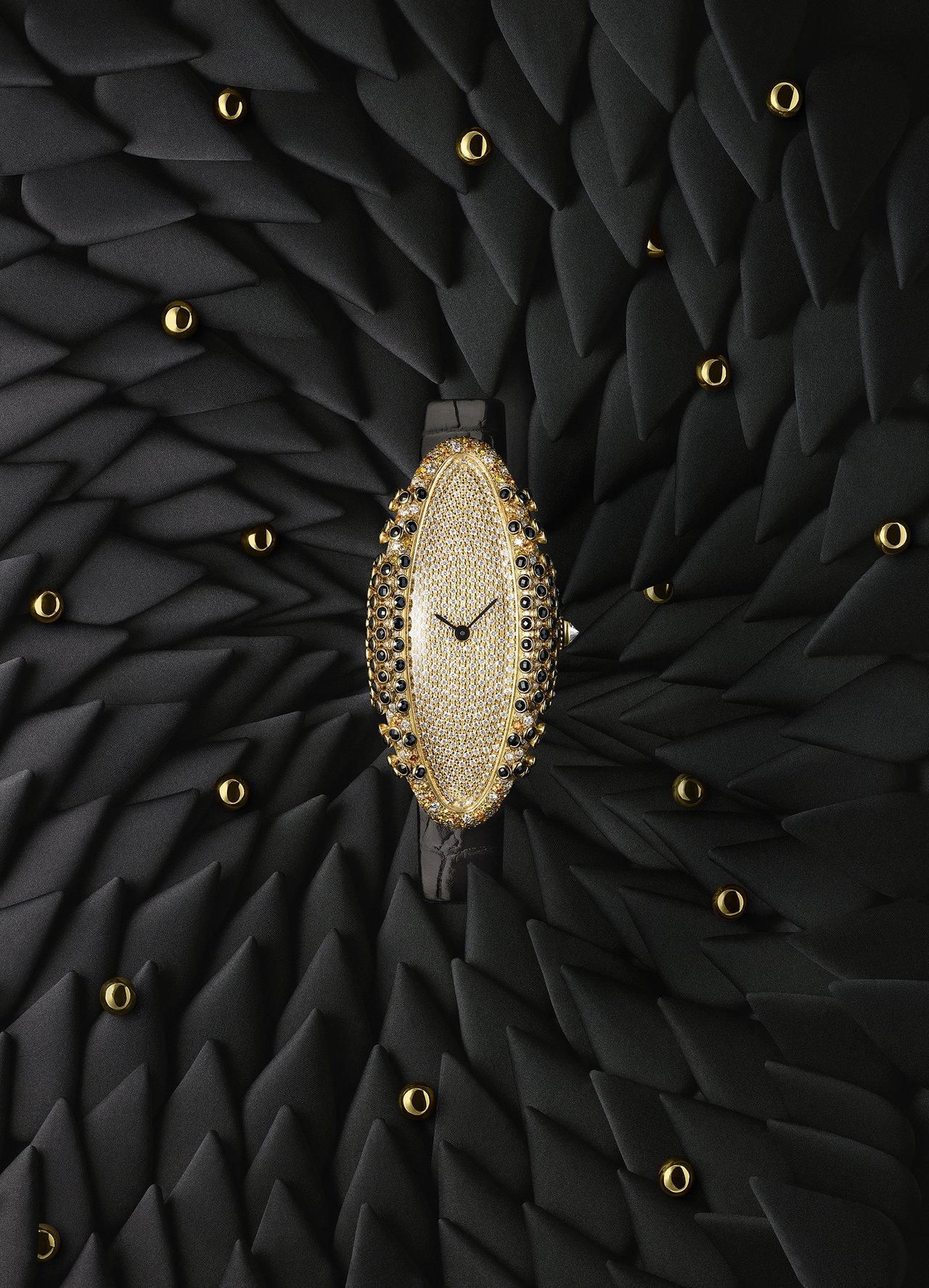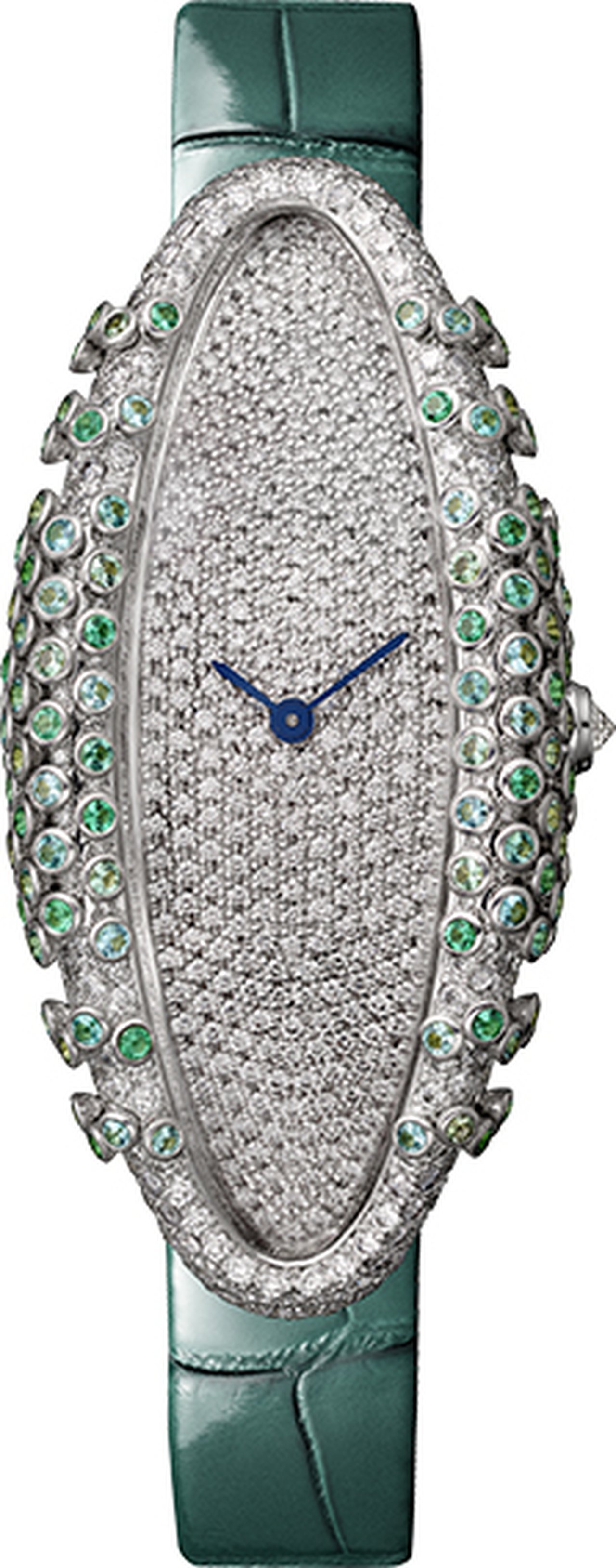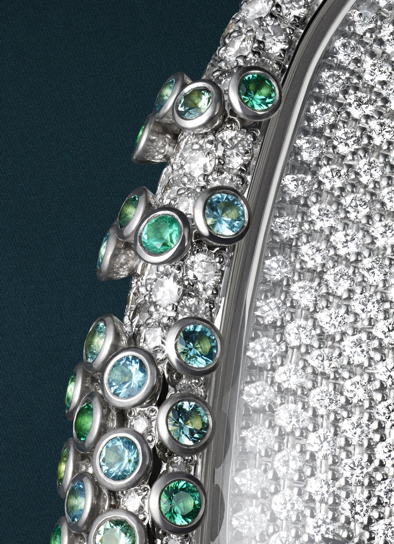 This watch’s volume is viewed as a surface for creation. It is studded with emeralds and Paraiba tourmalines, black spinels, yellow sapphires or diamonds. When perceived with the eyes, each gemstone becomes a