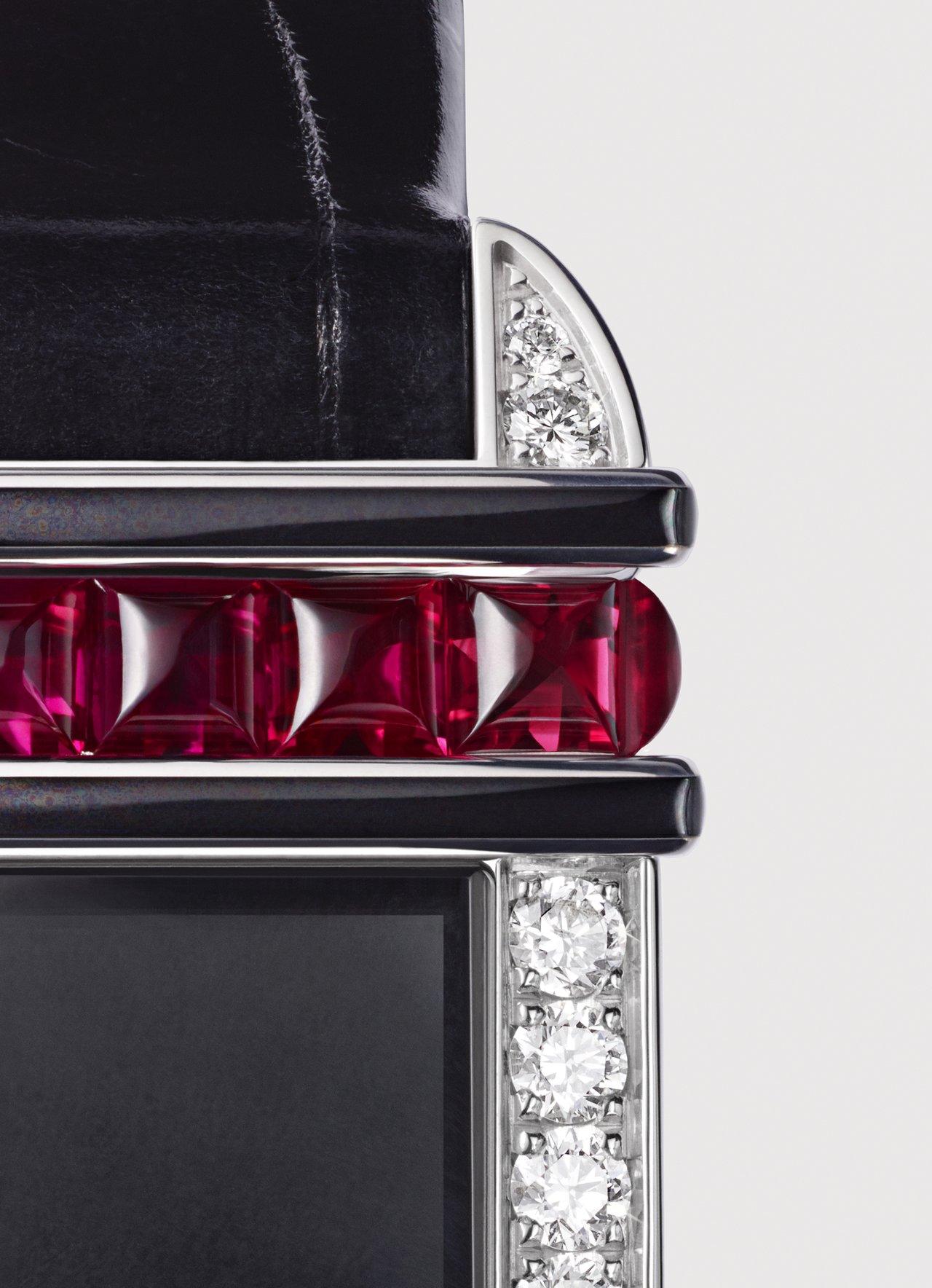 When placed in this prism of colours, the square is lengthened to become a rectangle bordered by two lintels of calibrated rubies highlighted by black enamel. A line of diamonds adorns the brancards and edge. The complete composition and the tension between the coloured elements and the diamonds strengthen the original architectural reference of this watch, available as a limited edition of 100 pieces. The challenge of Cartier Libre was to reconnect forms and origins; intentions and aesthetics.