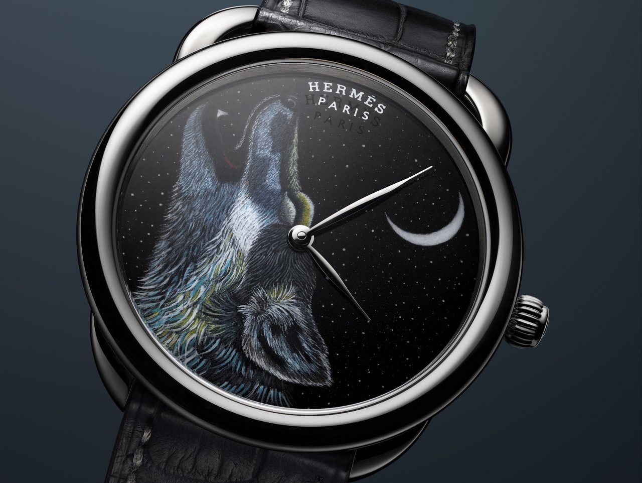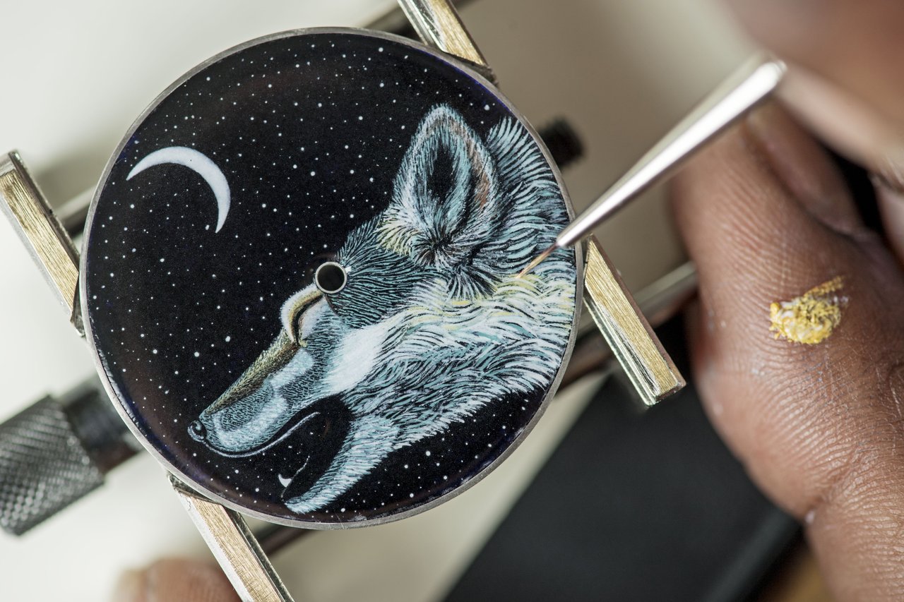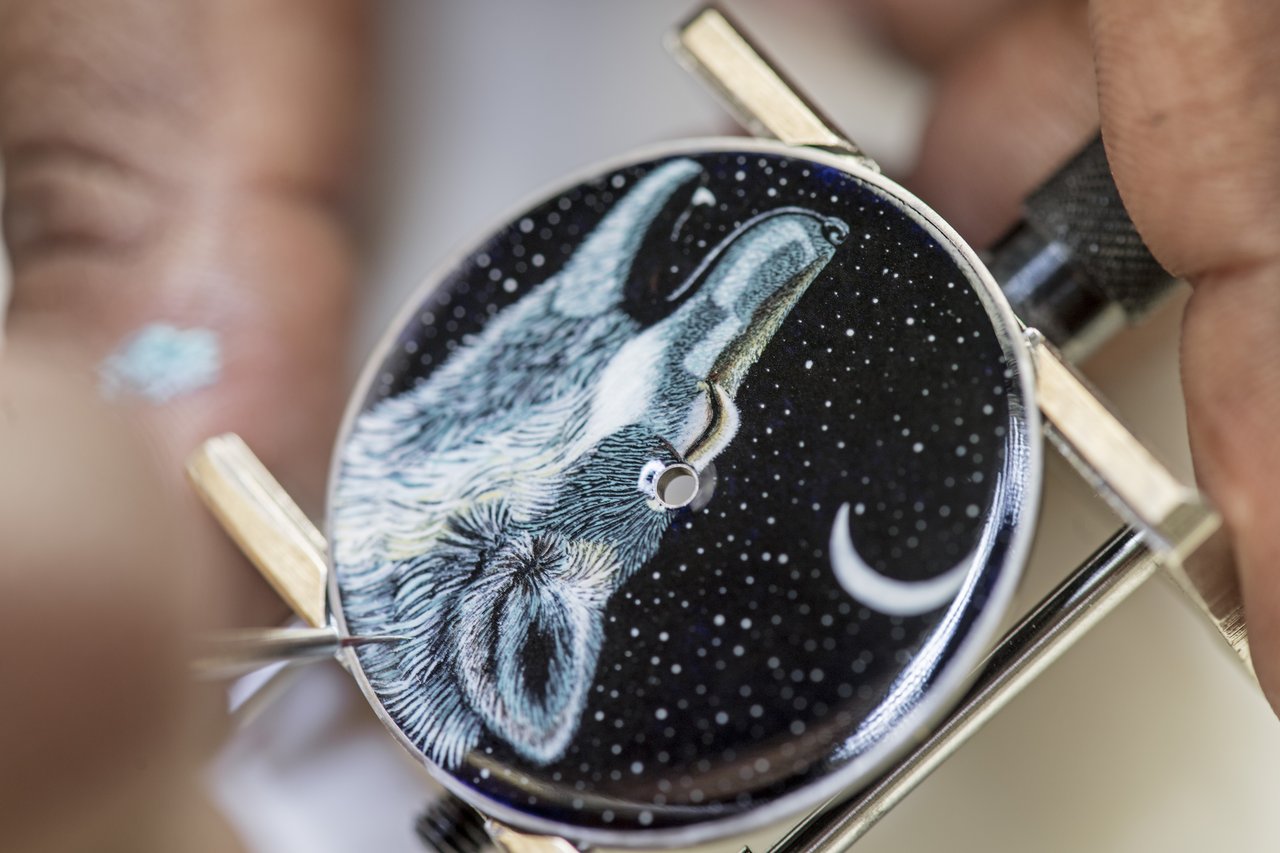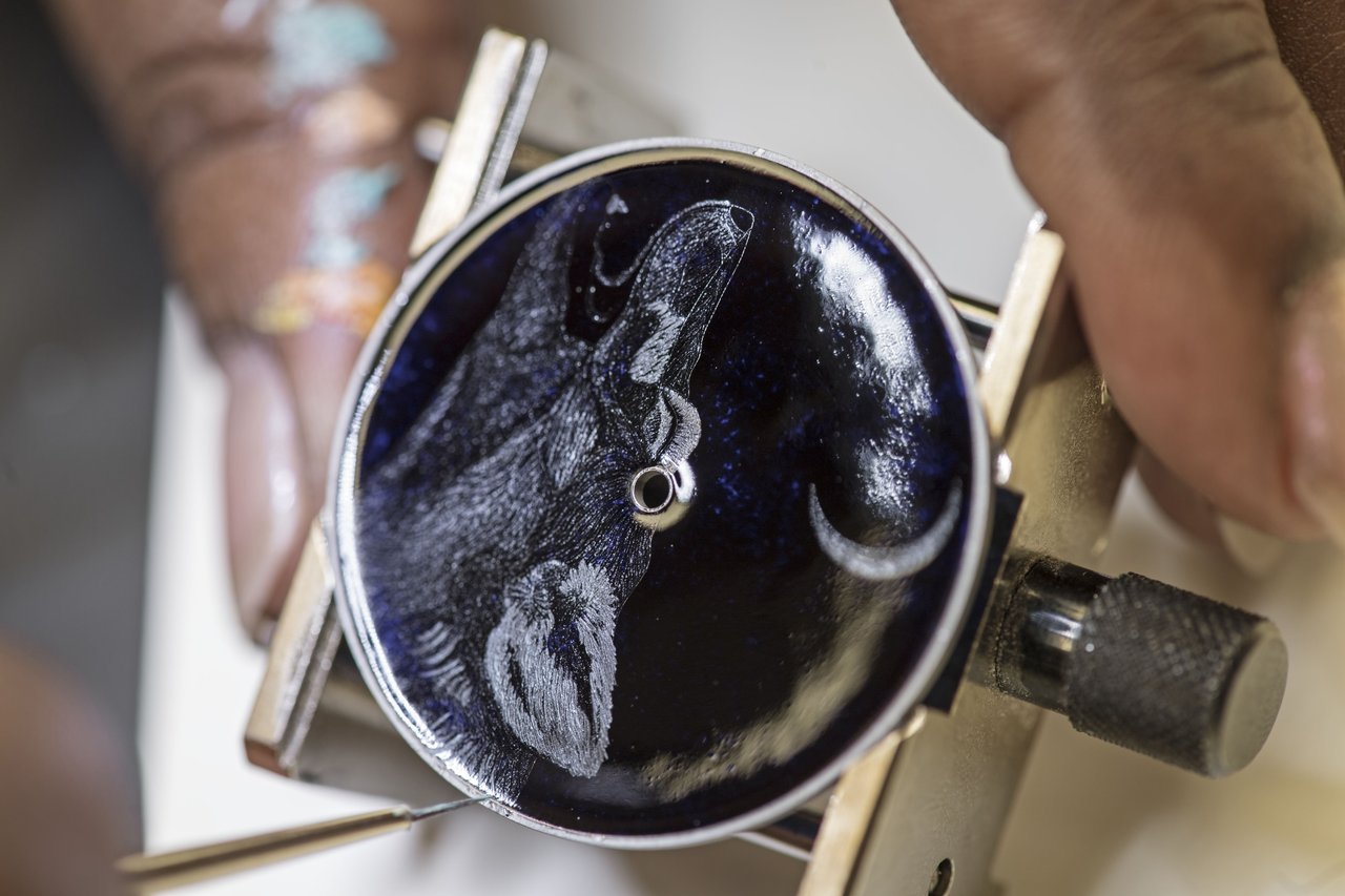 This miniature scene is beautifully framed by a white gold case and a matt graphite alligator strap.