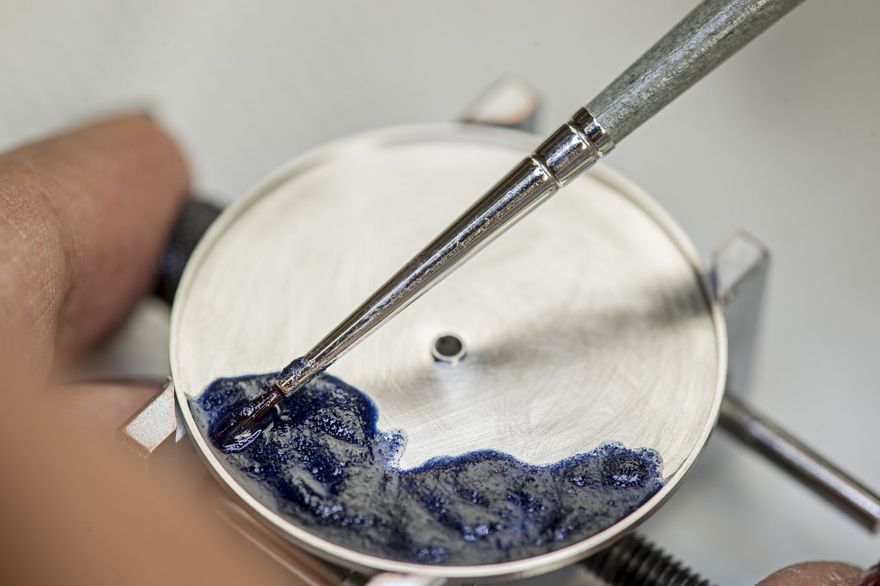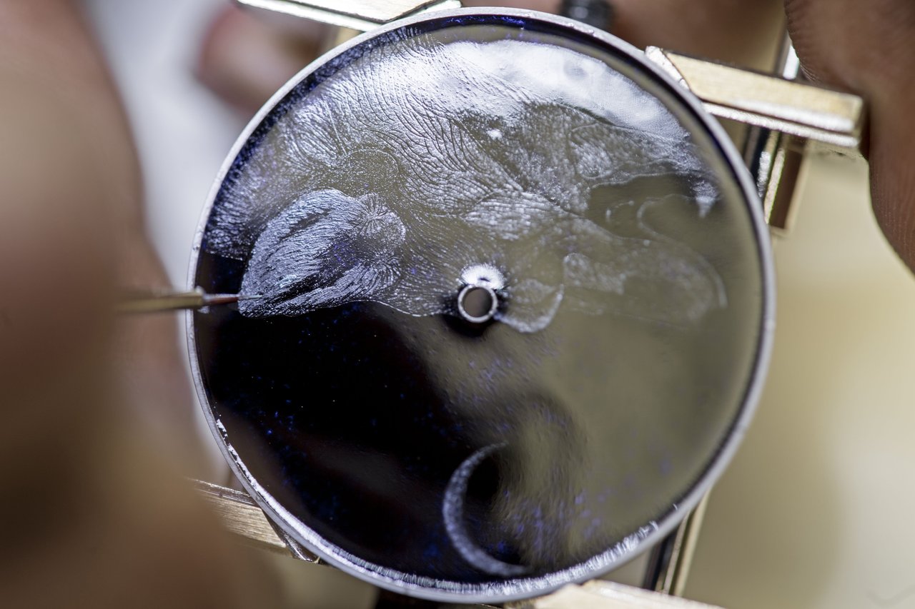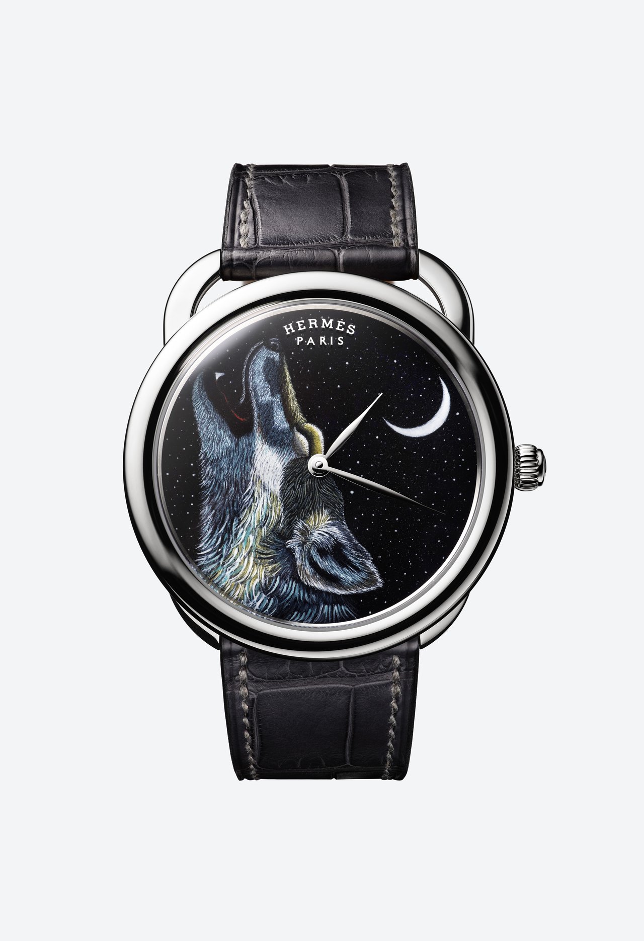 This miniature scene is beautifully framed by a white gold case and a matt graphite alligator strap.