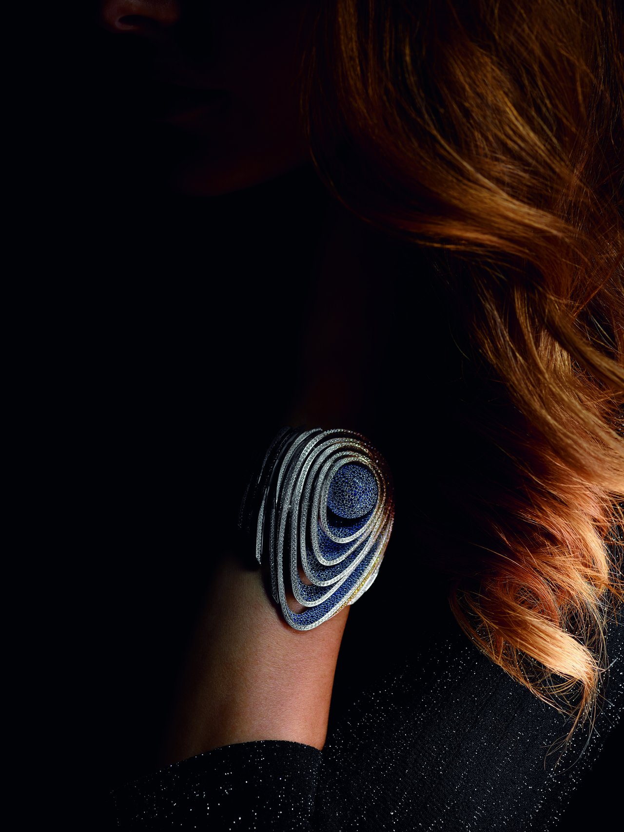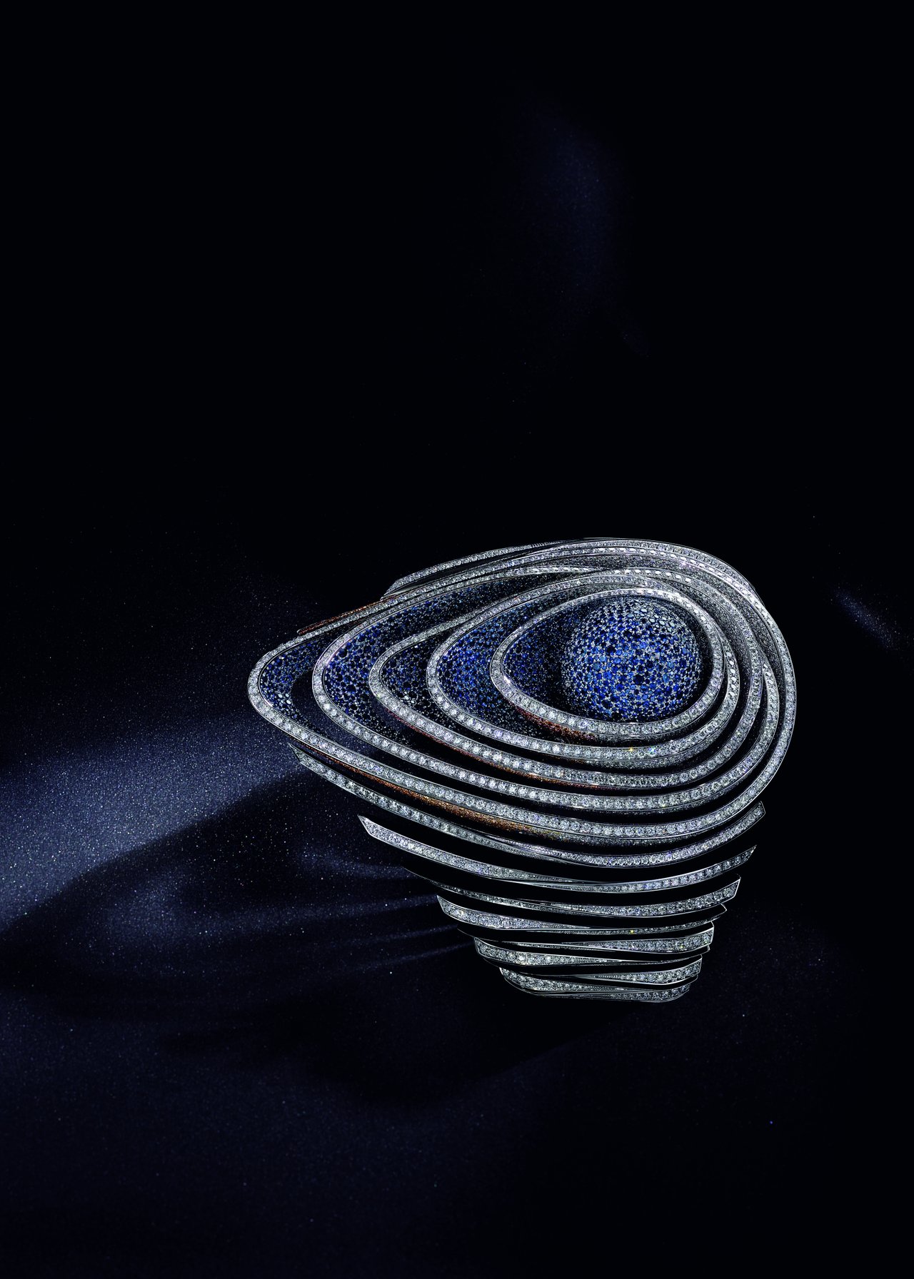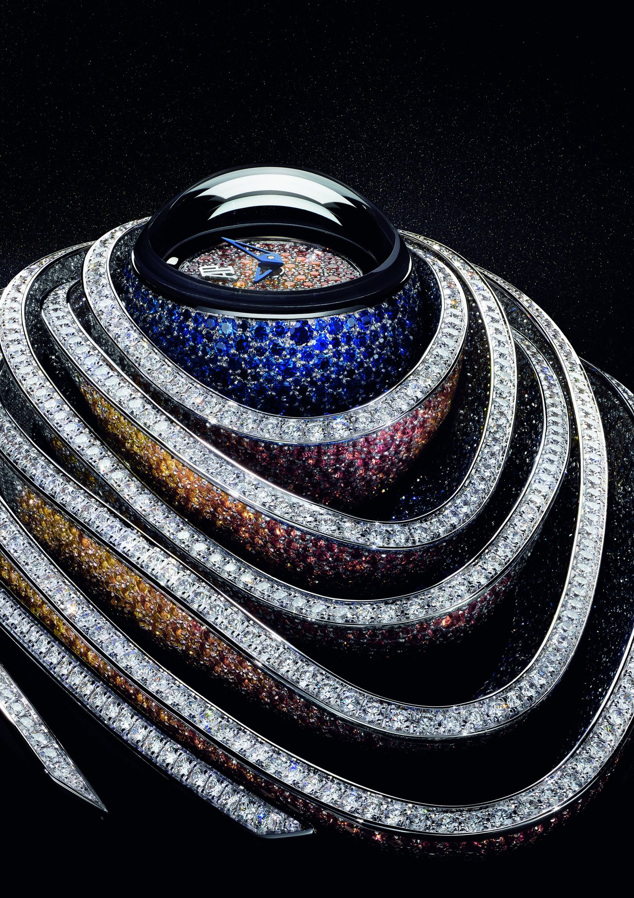 This piece features more than 12,000 stones, each rigorously selected, individually cut and set by hand. The central petal-shaped rings are entirely snow-set with diamonds and graded sapphires in 6 graded shades of blue and orange, each in 20 different diameters ranging from 0.5 mm to 1.5 mm in size. Multifaceted, this piece offers a play of colour and light that changes depending on the perspective from which it is seen. It took approximately 1,050 hours to gem-set this piece.