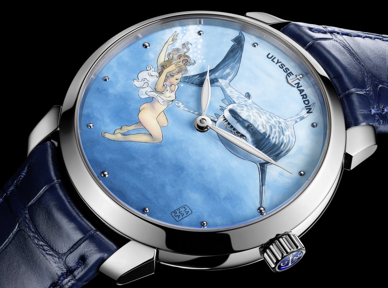 Manara has created just ten of these illustrations, a series that Ulysse Nardin has reproduced using micro painting. Ten pieces per drawing will be produced in stainless steel and ten pieces in rose gold, making the series limited to a mere 200 pieces in total.